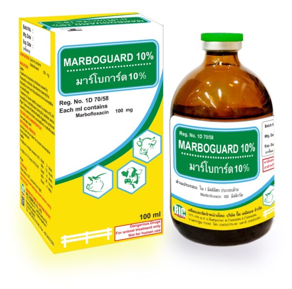 Marboguard 10% เป็นยาปฏิชีวนะ Fluoroquinolone สำหรับวัว สุกร และแกะ ใช้รักษาโรคติดเชื้อทางเดินหายใจ เต้านมอักเสบ และ MMA Syndrome ออกฤทธิ์ยาวนาน ปลอดภัยสูง ปรึกษาสัตวแพทย์ก่อนใช้